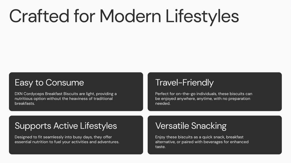 Developed by DXN, these biscuits go beyond ordinary breakfast snacks. They offer a refined way to support daily vitality while fitting effortlessly into busy routines. Light yet satisfying, they are ideal for those who seek convenient nutrition without compromising on quality or purpose.