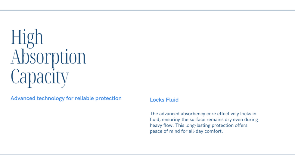 The advanced absorbent core quickly locks in fluid and distributes it evenly. These high absorbency sanitary pads keep the surface dry, making them suitable for heavy flow days and long working hours.